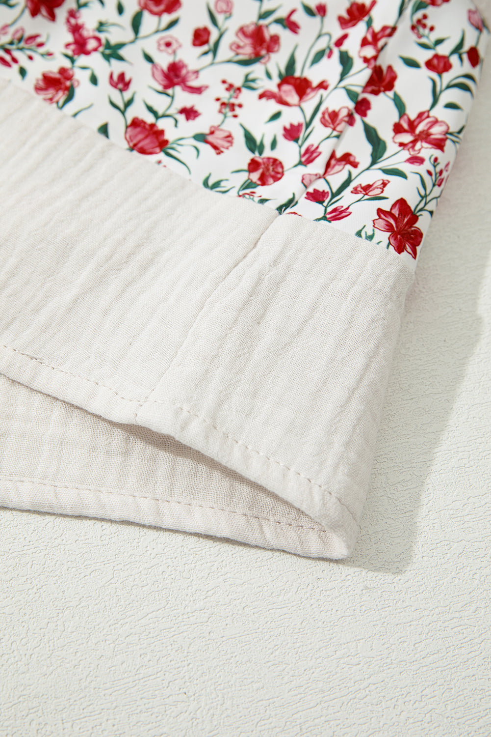 Red Floral Print Gauze Patchwork Henley Button 3/4 Sleeve Blouse