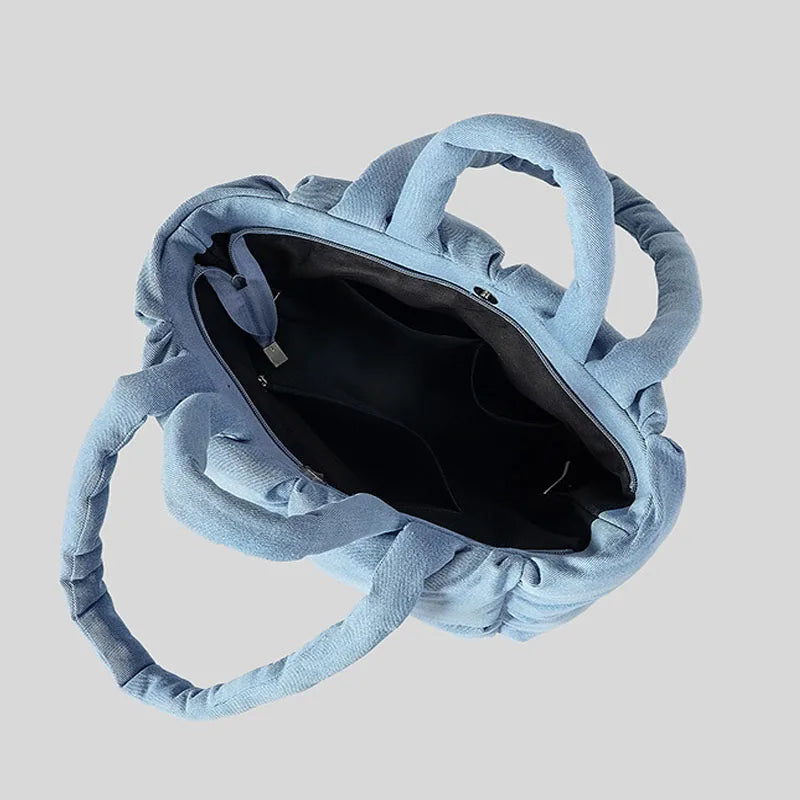 Padded denim puffer tote bag for women front view Quilted denim puffer shoulder bag styled with winter outfit Warm winter denim puffer bag side and strap detail Casual denim tote with quilted padded design Puffer shoulder bag close-up of quilting Denim puffer tote bag worn over the shoulder Interior view showing zipper compartment and phone pocket Warm winter quilted denim handbag on table Casual denim puffer tote detail shot Women wearing padded denim puffer bag in winter Solid denim puffer shoulder tote front and back Quilted denim puffer handbag on chair Model carrying padded denim winter tote Side angle of denim puffer shoulder tote Denim quilted tote bag styled with casual outfit Detail of padded handle on denim puffer bag Warm puffer tote bag detail view Denim puffer tote in winter street style look Interior compartments of padded denim tote Solid color quilted denim puffer handbag