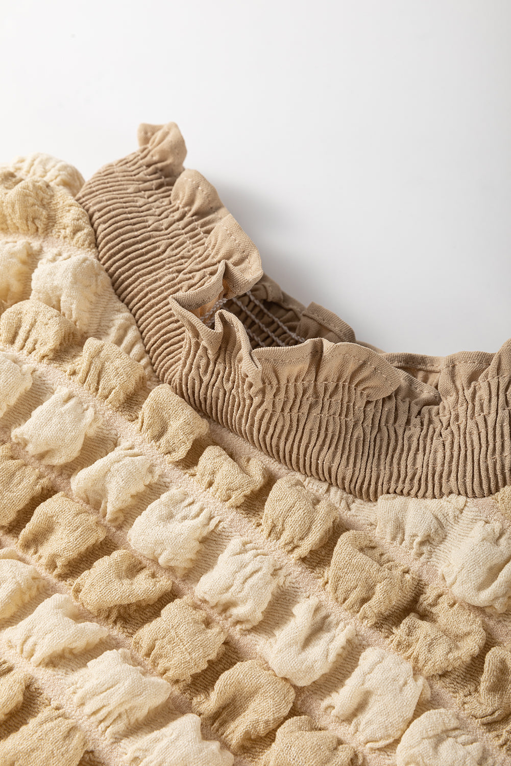 • This ruffled blouse creates a soft and romantic aesthetic.